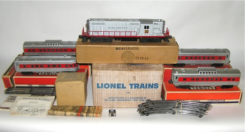 This is one not to be missed. The uncataloged set No. 711 (or better known cataloged as 1562W) Passenger Set that Lionel made in 1956 only. This Set includes the No. 2328 Burlington GP Diesel with Magnetraction and Horn, the No. 2444 Red-Stripe Newark Pullman, two No. 2442 Red-Stripe Clifton Vista Domes and a No. 2446 Red-Stripe Summit Observation Car. Comes with a 6019 Remote Control Track Set, A No. 1053 60 Watt Transformer, some paperwork, operating manuel, CTC Lockon, eight pieces of curved track, and three straights, all Individual Boxes and the rare Set Box. All that is pictured below.