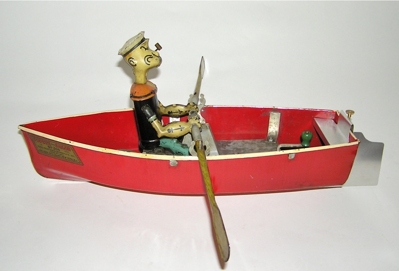Original Hoge Mfg. Popeye Rowboat Pressed Steel Tin Wind-Up Toy (DAKOTApaul)Here is wonderful and rare Popeye Toy. This is Popeye in rowboat from Hoge Mfg. Copyright 1935 King Features Syndicate. One of the most sought-after Popeye toys. Original oars and pipe. Rudder is a nice replacement. Decal is complete and very nice, marked "No. 268 Popeye The Sailor". Some darkening to figure and oxidation to bare metal arts. Measures 15" long. Wind-up working correctly. A neat early piece - don't miss this one, and please ask any questions. Buyer pays shipping (Insurance is included in the shipping and handling fees for this item - and that is why the shipping is so high. If you'd like NO insurance please let me know and the shipping cost will be much less). Please check out my other items currently listed, and save on shipping. Price: $2850 SORRY! SOLD!