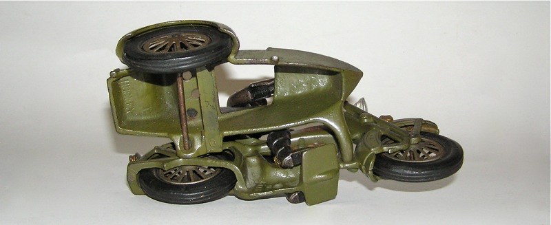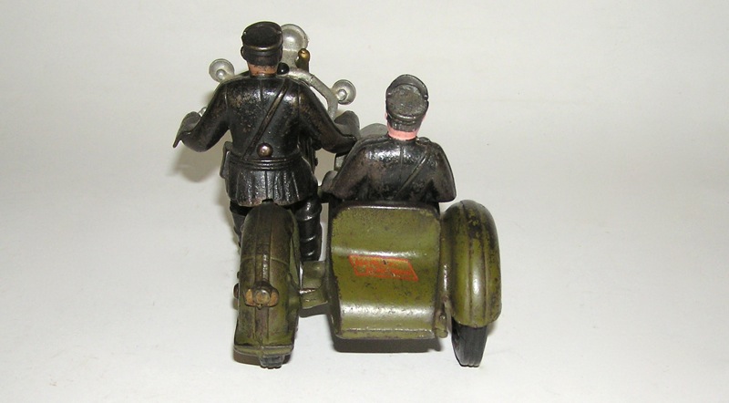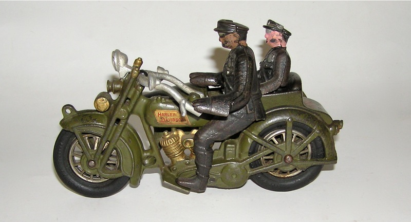 Hubley Cast Iron Harley Davidson Motorcycle w/ SidecarHere is a beautiful olive green Hubley Harley Davidson Motorcycle with side car. This has an original Harley decals on both sides of the gas tank - rarely seen, and on the back sidecar. Has both original COP driver and rider. Measures approx. 9" long. In great original condition - as seen in the pictures. Truly a nice item for your collection. Price: $2500 SORRY! SOLD!