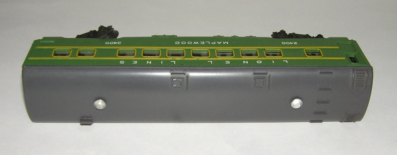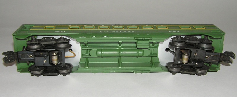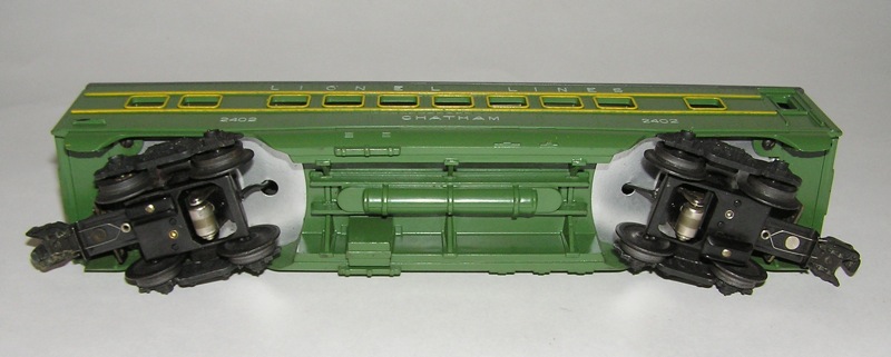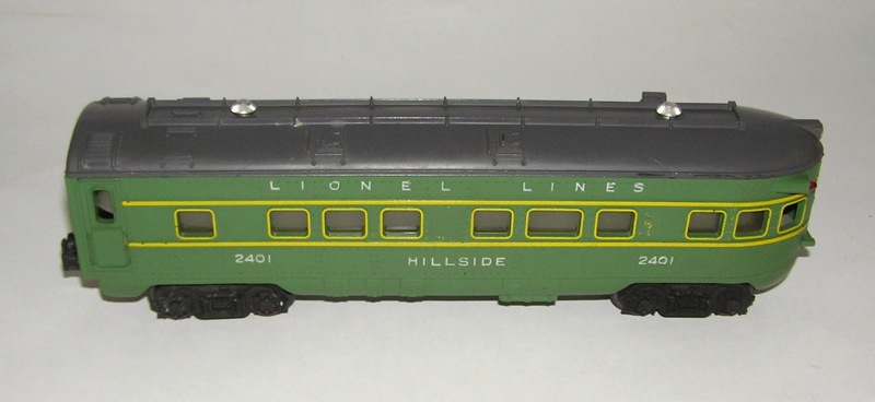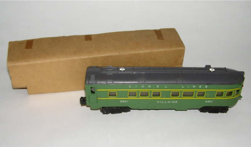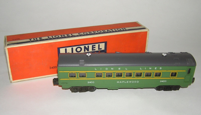 Set of (3) Lionel O gauge Passenger Cars 2400, 2401 2402 OBsHere is a very nice set of Lionel postwar "O" gauge Passenger cars. From Set No. 2140WS cataloged in 1948. (see last picture for that set - the Engine and Tender are being offered separately). We have the green with yellow trim illuminated No. 2400 "Maplewood" Pullman, the No. 2402 "Chatham" Pullman, and the No. 2401 "Hillside" Observation. Comes with two Boxes and one extra insert. Overall condition of the trains is excellent plus - as seen in the pictures. Great looking set. The sides and bottom are wonderful in like new condition, roof also clean. All light up when tested. The only issue on the cars is a split in the plastic vestibule floor of the 2400 car. Never seen this before. It doesn't come through and is tight (see pics). The best box is the 2400 box which is brick-like with liner. Does have a small amount of skinning on one end. The other box is missing flaps and has some tape on one end. This box also has its lining. Included is the liner for the third car but no box. I took a lot of pictures which show the condition well, however, if you have any questions let me know. Thanks. Buy with confidence. Price: $350 SORRY! SOLD!