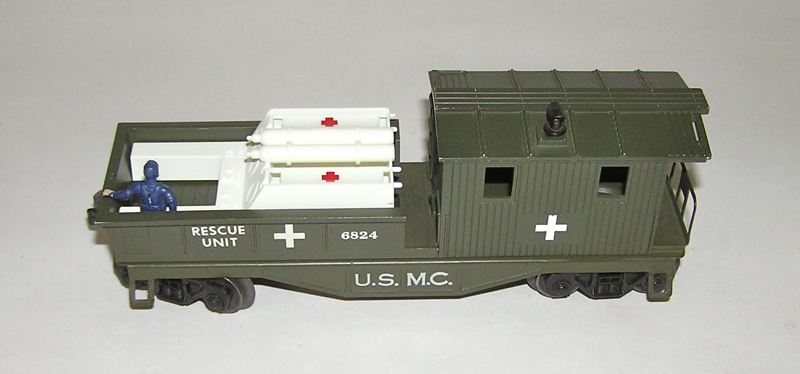 Lionel No. 6824 USMC First-Aid Medical Car - Nice!Here is a hard car to find. A Lionel USMC Military 6824 USMC First-Aid Medical Car. This one has an incorrect white section in the back. This white version is for the Lionel 6814 Rescue Car. However, these are original Lionel parts with stretchers and pontoons. Condition is clear in the pictures. Wheels look UNRUN. Only minor wear. Comes with a reproduction box. Don't miss. Thanks. Price: $109 SORRY! SOLD!