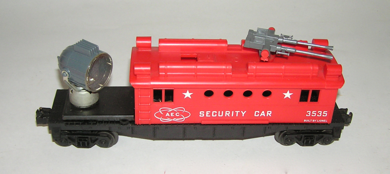 High Grade Lionel No. 3535 Postwar AEC Security Car w/ Box - Nice!Here is a very nice Lionel No. 3535 postwar "O" gauge A E C Security Car - made in 1960-61. This is the 1960 version with the perf. box included. Condition of the car is like new - as seen in the pictures. No breaks or cracks. Looks unrun. Box is missing one end flap. A nice one - don't miss. Price: $119 SORRY! SOLD!