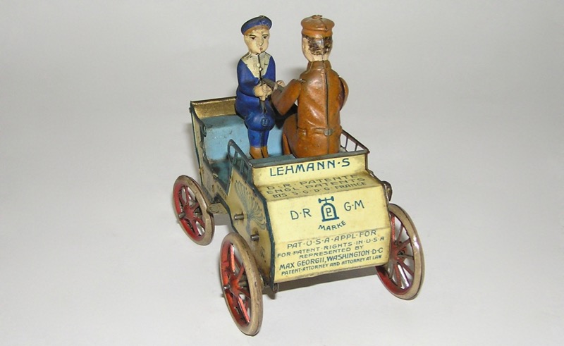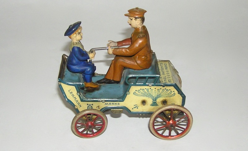 Lehmann German Made Naughty Boy Wind-Up Tin Lithography ToyHere is a Lehmann tin lithographed "Naughty Boy" Wind-Up Toy. The toy measures 7.5" wide by 8" tall. Circa. 1920s. In very good overall condition as you can see in the photographs. Some minor wear but overall looks good. Mechanism worked when tested. Rare toy. One for your collections - don't miss, and please ask any questions. Thanks. Price: $620 SORRY! SOLD!