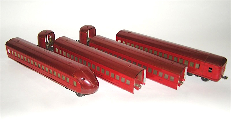 Rare Lionel Rail Chief Passenger Set w/ 792, (2) 793 794Here is a nice set of original Lionel prewar O gauge Rail Chief Passenger Cars. This set of (4) cars and (3) vestibules includes the No. 792, (2) No. 793 Coaches, and the No. 794 Observation - from the 1930s that would go with a 700E Hudon Scale Locomotive. These look to be in very good condition - as seen in all the pictures. The observation has some warps and chips to the underbelly. Also, some small belly warp to a 793, but minor. The rest look nice and straight. Some minor wear, but this set looks better than most. Pictures tell the story, and please ask any questions. Hard to find in original condition. Thanks. Price: $650 SORRY! SOLD!