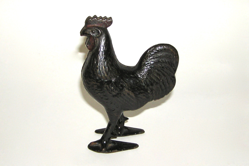Arcade Cast Iron "Rooster" Still Bank - Nice!Here is a wonderful original cast iron still bank. An Arcade Manufacturing cast iron "Rooster" bank made from 1910-25. This is the harder to find Black version with red and silver highlights. It measures 4-3/4" high. It is in very good condition - as pictured. Original screw. No breaks, cracks or repairs. A nice one for your collections. Price: $99 SORRY! SOLD!