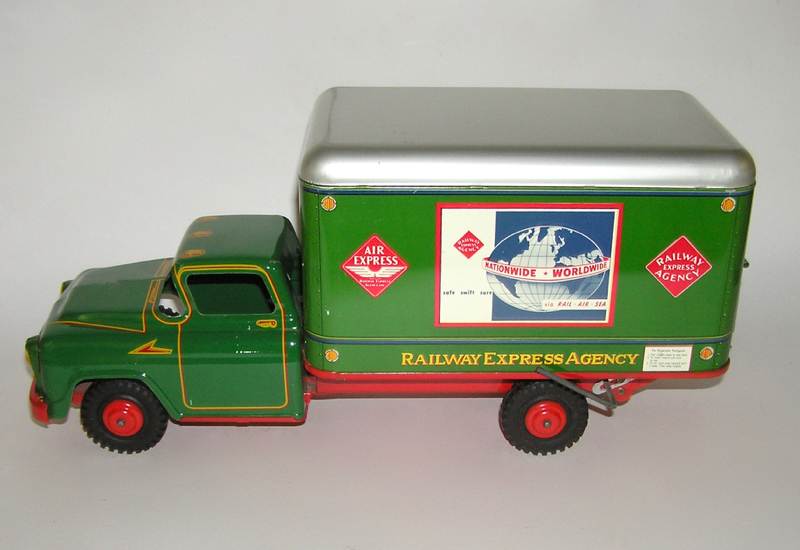 High Grade Marx Railway Express Agency Truck w/ BOXHere is a wonderful looking truck - a Marx Railway Expres Agency Truck with the original box with all inserts and accessories, including plastic loading cart and push cart, boxes of product and sealed stickers. Old store stock, slight rubbing on roof from box. In near mint, unused condition. Box measures 20-3/4'' L.This is one you won't be disappointed to own. Buy with confidence. Thanks. Price: $760 SORRY! SOLD!