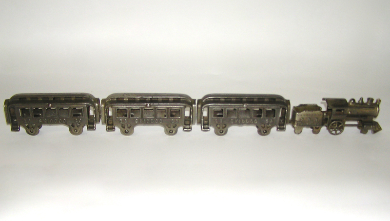 Nickel Plated Cast Iron Hubley Passenger Floor Train Set c.1910Here is a wonderful original cast iron floor train - a Hubley short stack Integrated tender nickel plated Engine - pulling (3) Hubley "Skiddoo" nickelplated Passenger Cars. The Engine measures 7-1/4" long. Each of the Passenger Cars measures 6-1/2" long. In very nice overall condition as you can see in the pictures. All the cars are original and complete. No breaks or cracks. Overall, you won't be disappointed with this toy. A great cast iron piece from the early 1900s. Don't miss. Price: $150 SORRY! SOLD!