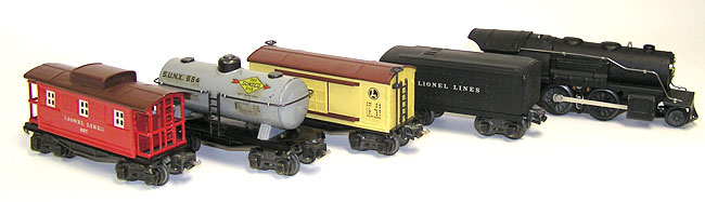 Rare Lionel Set # 8062 w/ Dull blk. 258, 2689TX 654 655Here is a fantastic looking Set of late prewar "O27" Lionel tinplate trains - with a rare No. 8062 Set Box, from the early 1940s. It features a great looking "Dull Black" No. 258 Steam Engine, with a hard No. 2689TX Tender. The set has the blacken journals and it includes the following freights - No. 654 Sunoco "Oil" car, the No. 655 rubber stamped Box Car, and the tuscan roofed No. 657 Caboose. Also, we have the individual boxes, a No. 1036 transformer, some track (8-curves, 3 straight, connector), and the Set Box. I think you can tell from the pictures that this set is in wonderful overall condition. The engine and tender look very nice. The cars are also very pretty as seen in the pictures. The engine box is missing some interior flaps, and one flap is held on with tape. The tender box is missing an end flap, the others are in decent shape. The set box has some old masking tape, and is missing an interior flap. Don't miss this rare Lionel Set. Price: $356 SORRY! SOLD!
