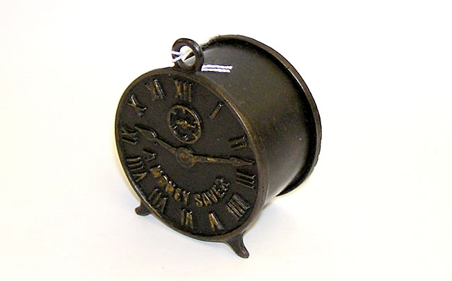 Arcade Cast Iron and Metal "A Money Saver" Clock BankHere is a neat bank from Arcade. Dated circ. 1909. It is called "A Money Saver" clock bank. Measures 3-1/2". Very nice original condition as seen in the pictures. Price: $69 SORRY! SOLD!