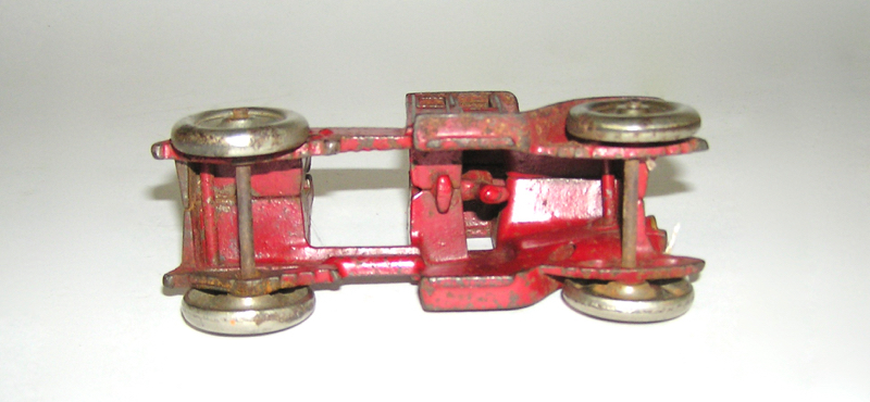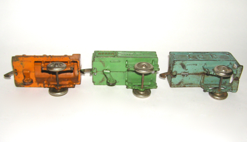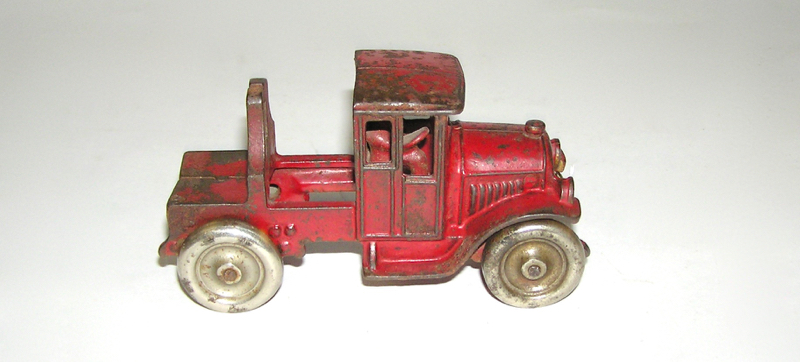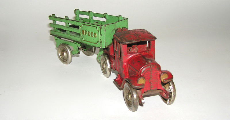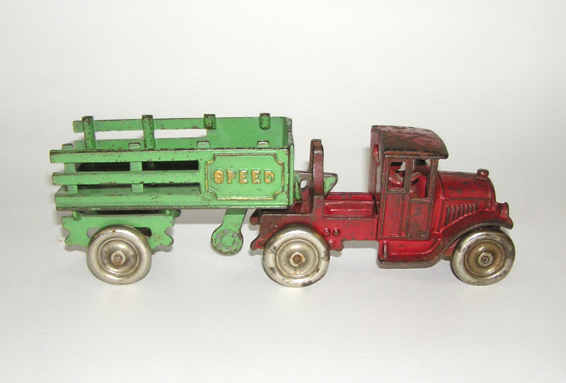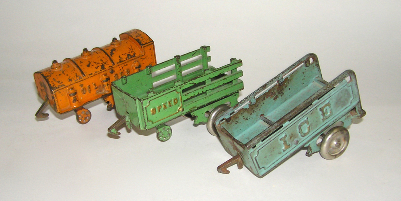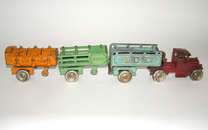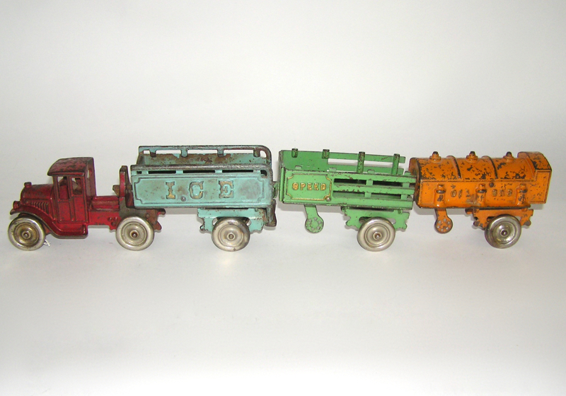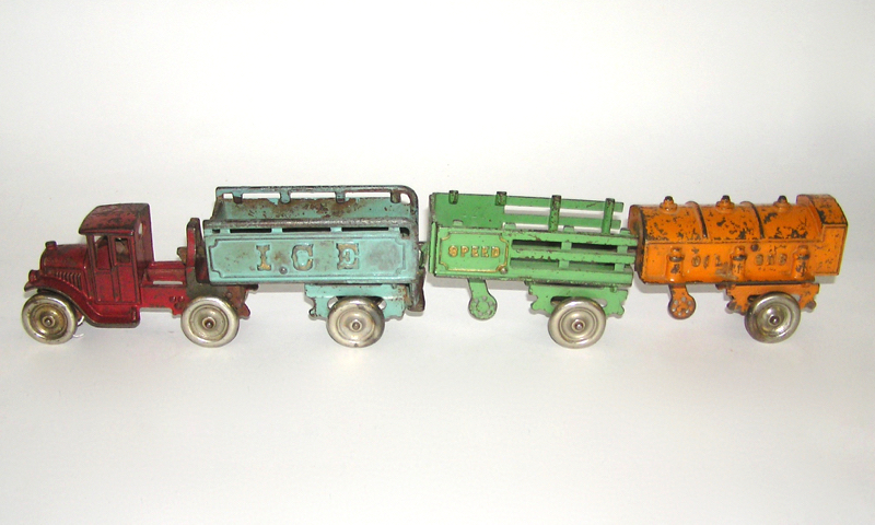 Kenton Cast Iron Tractor Tandem w/ Gas/Oil Tank, Ice & Speed TrailersHere is one of my favorite cast iron automotive toys. So cool. This is a Kenton Tractor Truck pulling three trailers - a Gas and Oil Tank Trailer, an Ice Trailer and a Speed Trailer. You can connect them all together or separately and have three different trucks. Cab has the original driver inside. Nickel plated cast iron wheels. A large toy measuring 22" long when connected together. The tractor is 6-1/4", and each trailer measures approx. 5-1/2" not including its hook. Condition is very good as you can see in the pictures. It is all original, with no breaks, cracks or repairs. I do see that the Kenton Ice trailer is missing its front support wheel. A wonderful toy from the 1920s that should not be missed. Buy with confidence. Price: $765 SORRY! SOLD!