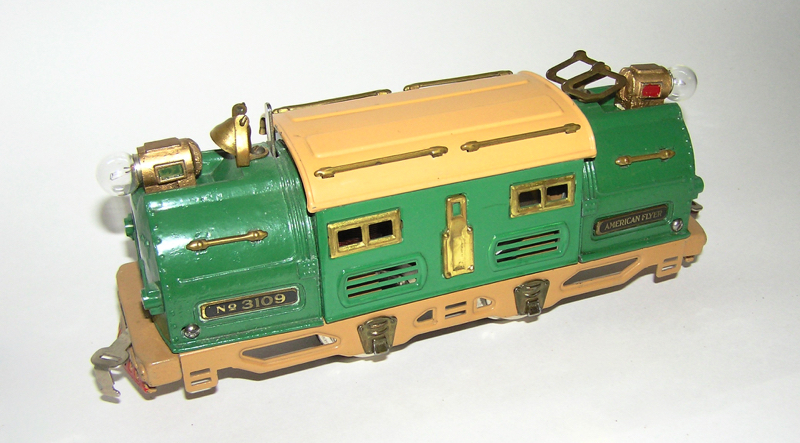 Scarce American Flyer POTOMAC Set w/ Die-Cast 3109 Engine 3171 3172Here is a wonderful passenger set of prewar American Flyer O Gauge trains. This is Set No. 1326 "Potomac" cataloged in 1938. The set features a di-cast and tinplate No. 3109 Engine pulling (2) No. 3171 8-wheel Pullmans and a No. 3172 Observation. Comes in its original Set Box with only the Engine box. This set is in what I call "scary good" original condition. Near mint with little if any run time. It is a WOW! The Engine was re-wheeled and has some small surface scratches - but that's it. Ran well when tested. The cars are all near mint as pictured. The set box has a tear on on the bottom side, but is in nice condition. A set not to be missed. Buy with confidence. Thanks. Price: $995 SORRY! SOLD!