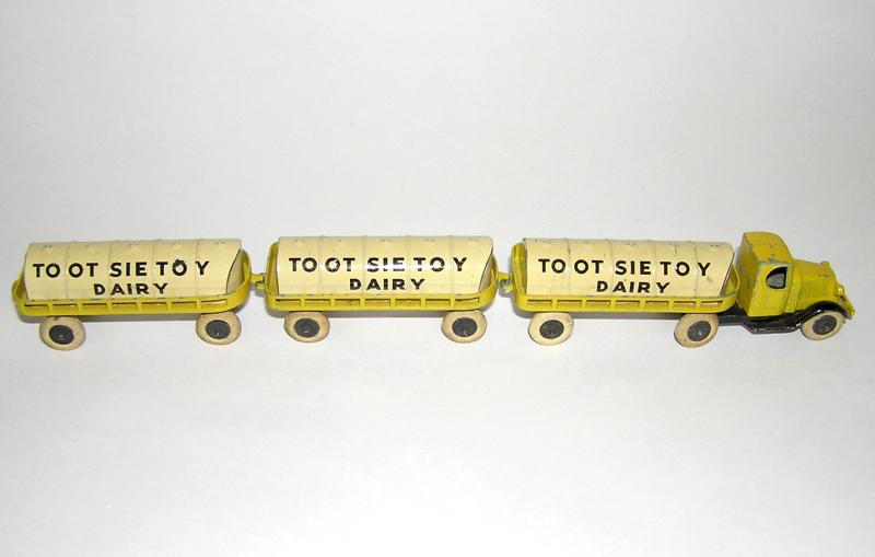 Wonderful Vintage TootsieToy Dairy Tractor w/ 3 Trailers 192 SetA really nice original TootsieToy Tractor pulling (3) DAIRY Trailers. Measures a total of 13-1/2" long. In great shape - as pictured. NO BROKEN OR MISSING PARTS. Just a very cool looking truck. Original white rubber tires. One for the collection - don't miss. Price: $175 SORRY! SOLD!