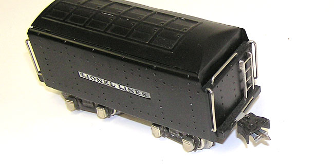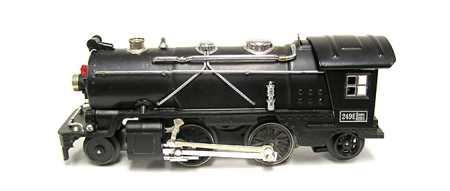 Lionel No. 249E Prewar Black Locomotive & 265T TenderHere is a great looking Lionel No. 249E Steam Locomotive and a No. 265T Tender - both in the rare black color. Size of the loco is 10" long, and the tender 6-1/2" not including its couplers. This is a beautifully restored set. Engines runs forward and reverse. Lights look great when going around track. This is an engine that is not generally seen very often. Price: $199 SORRY! SOLD!