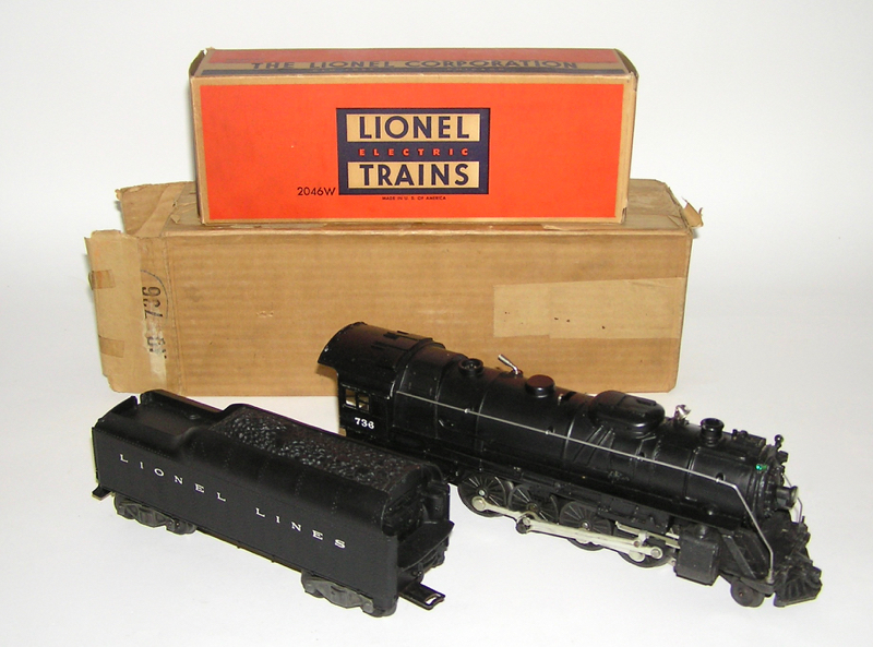 High Grade 1954 Lionel 736 Loco w/ 2046W Tender +BoxesHere is a high grade Lionel No. 736 "O" gauge Berkshire 2-8-4 steam locomotive with its No. 2046W Lionel Lines Tender. One of the better ones I've seen in quite a while. This is the hard 1954 version that has the heat stamped lettering on the cab, the collector assembly attached with two screws, and the die-cast trailing truck. Also, we have an extremely nice 2046W tender. All appear to be in like new condition. I only see minor signs that these have been on the rail. The engine runs well in forward and reverse. Tender is just beautiful. I do not see anything wrong with either. Engine box has some paper tape on the outside. Some stains and writing. Comes with a nice original interior linsert. A beautiful brick-like Tender box with insert. I've included many photos for you to see all, and please ask any questions. Don't miss this set for your collections. Price: $499 SORRY! SOLD!