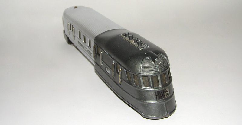 Lionel Prewar Flying Yankee Train Set No. 267E 616E 617 SET BOXHere is a wonderful set of Lionel 'O" gauge trains from the 1930s. This is a "Flying Yankee" Streamliner Set No. 267E, which consists of the No. 616E Engine with (2) No. 617 Coaches and a No. 618 Observation. This is rare as it comes with its individual boxes and a very nice SET BOX. I think the condition is clear from the photographs - which is excellent plus. There is a couple of marks on the gray of the engine, and some wear to the bottom of one of the 617 carsr, but other than that, a very clean set. The chrome shows no corrosion. Was put on a test track and it lights up and runs in forward and reverse. However, the e-unit is somewhat sticky, as it will go into reverse well, but sometimes it won't go forward. With some patience it works fine. The Individual boxes have some missing interior flaps and some repair. The Set box is really nice with a strong label - some pencil writing on the front. A neat set of trains, don't miss! Price: $935 SORRY! SOLD!