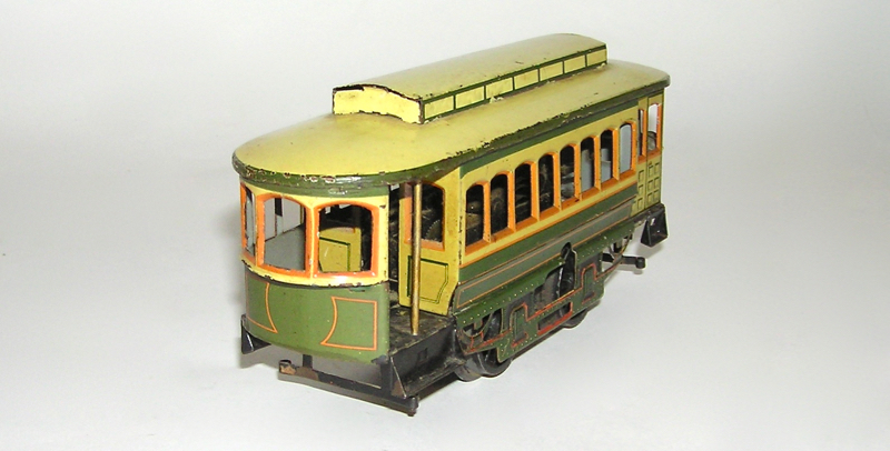 Antique German Made Bing Tin Lithographed Clockwork TrolleyHere is a wonderful early tin toy - a German made Bing clockwork "O" gauge Trolley. Measures 8-1/4" long. Lithographed tin with a painted roof, done in green and yellow roof, orange trim, clockwork mechanism, features reversing action. Wind-up mechanism works great. Strong roof for this piece. A little paint flaking on inside floor of the cab. A great early toy. Buy with confidence. Price: $395 SORRY! SOLD!