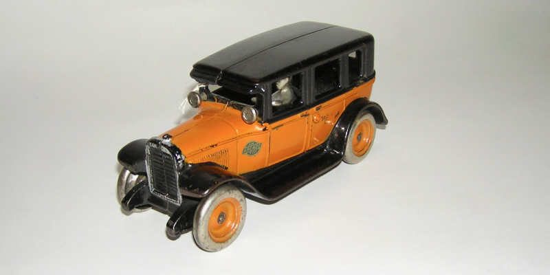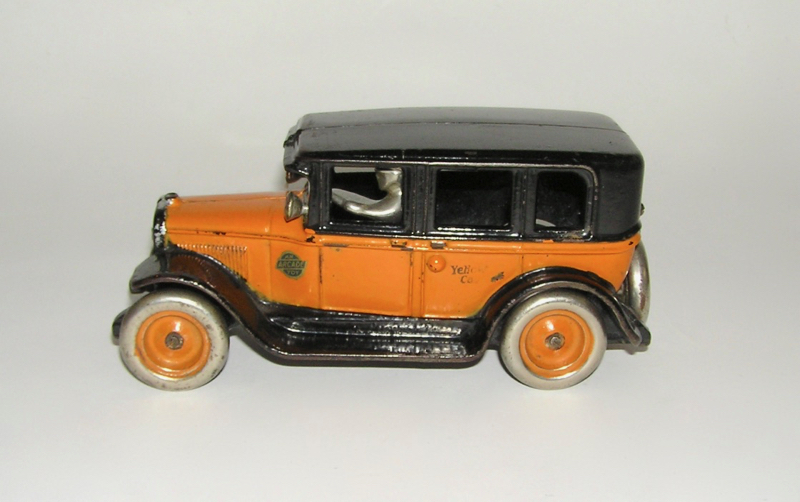 High Grade Arcade No. 5 Limousine Cast Iron Flat Top Yellow CabHere is your chance to own a wonderful Arcade No. 5 Yellow Cab Limousine. Called "The Flat Top" Cab. This is the version with nickel plated cast iron wheels. This measures 8-1/2" long. Rarely seen in this kind of condition. This has it all. Only a couple small places of wear. A little rubbing on the roof, and a spot on the drivers side. I think the pictures speak for themselves. This is how you want to collect - best condition possible. A rare find - don't miss. Thanks. Price: $1850 SORRY! SOLD!