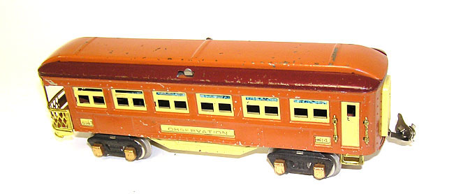 Lionel Set # 144E w/ 262E and Tender + 613 614 615 Pass. CarsHere is a great set of Lionel prewar "O" gauge trains from 1933-34. This set features the No. 262E 2-4-2 tinplate Steam Locomotive with its matching tender. Also, it includes the following terra-cotta and maroon two-toned illuminated passenger cars - the No. 613 Pullman Car - the No. 614 Observation Car - and the No. 615 Baggage Car. Price: $699 SORRY! SOLD!