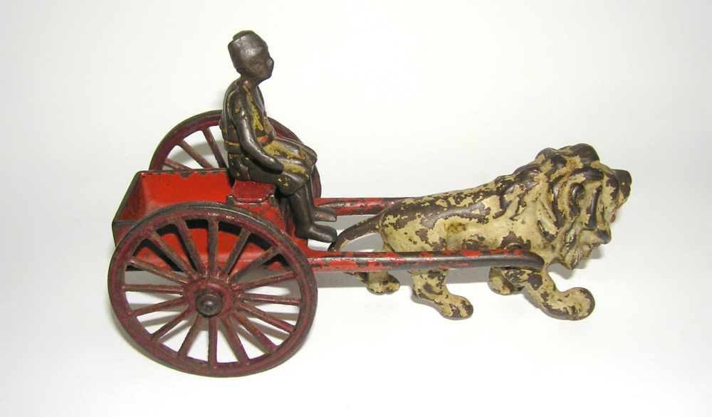 Scarce Kenton Cast Iron Lion CartHere is a nice original Kenton Cast Iron Lion Cart with seated driver. From their early Egyptian Series. Painted red with white lion. Length is 7-1/2". This one is invery good condition for its age with no breaks or cracks. I believe the pictures tell the story on this one. Don't miss. Thanks. Price: $225 SORRY! SOLD!
