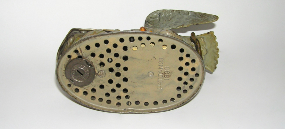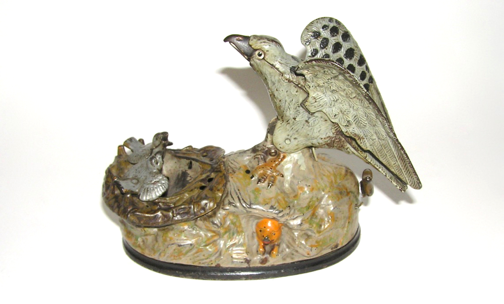 J & E Stevens Cast Iron Eagle & Eaglets Mechanical BankJ. & E. Stevens Co., designed by Charles Henn, patented 1883 - this is the Eagle and Eaglets cast iron mechanical bank. You place a coin in the eagles beak, press the lever in the back, and the coin is dropped into the nest as the eagle raises its wings and the little birds move up and down. A great action bank - and good looking too. This one is in very nice original condition - as seen in the pictures. Beautiful paint. No breaks or cracks. Mechanism works well. Don't miss this one for your collections. Price: $850 SORRY! SOLD!