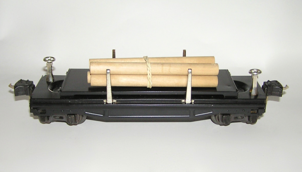 Lionel No. 3811 O Gauge Operating Lumber Car w/Load +BOXThis is a very nice prewar Lionel "O" gauge No. 3811 Operating Lumber Car with wood load. The flatcar itself is in excellent plus condition, the box is good - as seen in the photographs. Automatic Box Couplers. Blackened journals. Original wood load. Trucks in great shape. The box has some skinning on the end, and some flap repair. What is nice is that it still has its original liner. Overall, a nice clean car. Don't miss. Thanks. Price: $99 SORRY! SOLD!