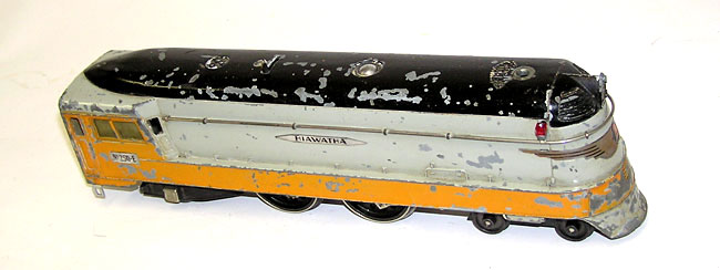 Original Lionel Hiawatha No. 250E with 250W Tender Nice!Here is the Lionel prewar "O" gauge Hiawatha No. 250E engine with its matching No. 250W Tender. Condition is as seen in the pictures. Still retains its original finish, but is chipped as seen. Runs in forward and reverse. Whistle tender did not work. Don't miss a chance to own an original! Price: $479 SORRY! SOLD!