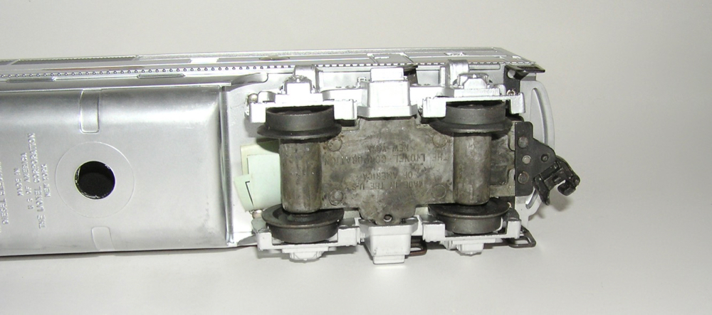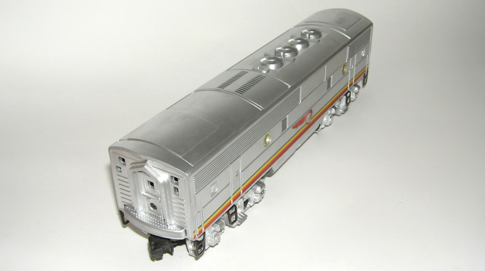 High Grade Lionel No. 2343C Postwar Santa Fe "B" Unit + BOX LNHere is an extremely nice original Lionel No. 2343C postwar "O" gauge Santa Fe "B" Unit. This has the louvered roof vents. This still has that new silver look to it. A couple small rub marks on the roof from box rub is all that keeps this from being new. Wheels are unrun. Inspection slip still tucked into wheels. Box is brick-like, all flaps, original insert and wrap. A very nice unit for your Santa Fe sets. Price: $499 SORRY! SOLD!