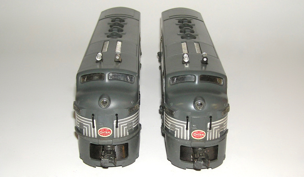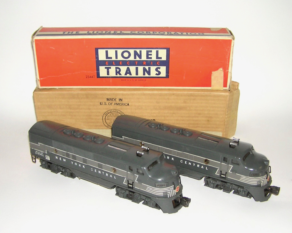 High Grade Lionel Postwar 2344 NYC F3 Diesels AA Units +BOXHere is a very nice pair of Lionel No. 2344 F-3 New York Central AA units made from 1950. These are the version with the black GM decal and screen top vents. Size is 13" not including its couplers. The power A unit contains dual motors with Magnetraction. Condition is excellent - as seen in the pictures. The powered unit runs in forward and reverse. Horn has not been tested. Shell is virtually flawless. The battery compartment is clean. Decals are excellent, one black one is a little scratched. All porthole windows original. The non-powered unit is the same level of quality. Decals 100%. Power unit box is excellent. Original insert. The "T" box has all flaps. Some with repairs. Masking tape on one end. Missing insert. A real nice set for your collections. Please ask any questions - don't miss you won't be disappointed. Thanks. Price: $450 SORRY! SOLD!