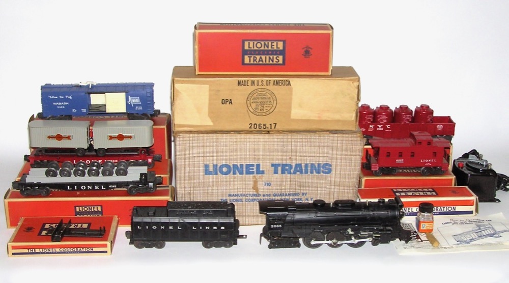 Here is a neat Lionel postwar Lionel set from 1956. Set No. 1561WS that includes the No. 2065 Diecast Steam Engine with Smoke, Headlight and Magnetraction, the No. 6026W Whistle Tender, the No. 3424 Operating Wabash Brakeman Set, the No. 6262 Flat Car with Wheels, the No. 6562-25 Canister Car with (4) cannisters, the No. 6430 Flat Car with Trailers and the red No. 6257 SP-Type Caboose. This comes with the 1053 Transformer, a 6019 track control set, some paperwork, all individual Boxes, and the rare Set Box. All that is pictured below.