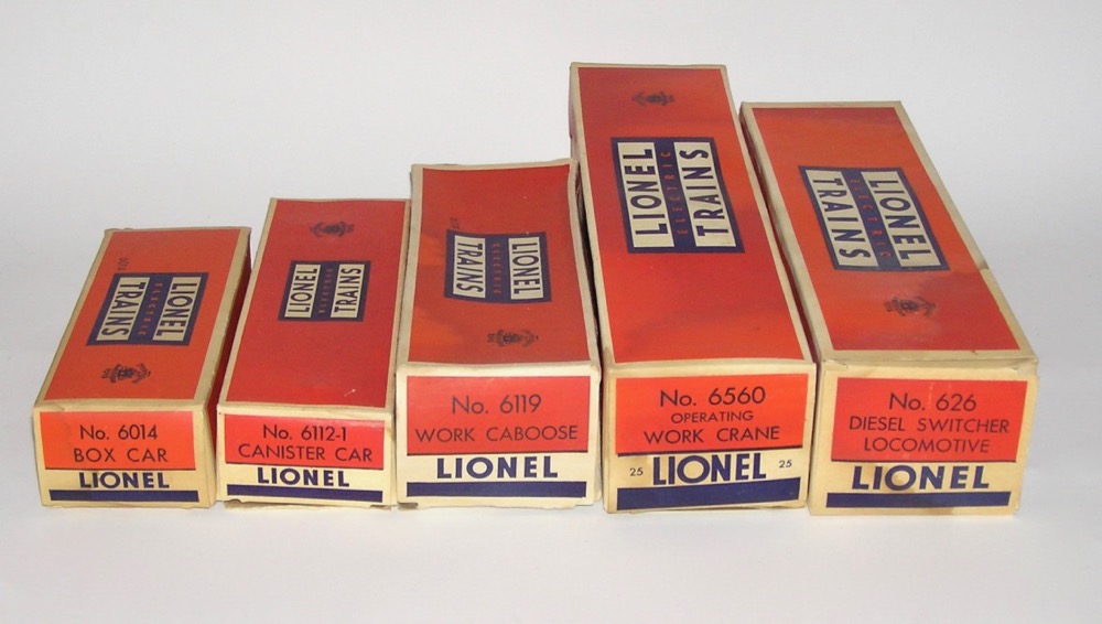 Nice Boxed 1956 Uncatalogued Lionel Set 9602 w/ 626 Plus FreightsHere is a nice set of Lionel postwar Trains that you will not see very often - this is a Lionel uncatalogued freight Set No. 9602 - from 1956. This set includes the No. 626 B&O Switcher, a No. 6112 gondola with red canisters, a No. 6014 Baby Ruth boxcar, the No. 6560 red crane car, and the 6119-25 orange work caboose. Comes with a No. 1020 Crossing track, (1) 90-40 packet, a 6029 track, a 1015 Transformer, all individual boxes and the rare Set Box. All that is in the many pictures. Trains look to be in excellent to like new original condition. I took a lot of pictures so you can see for yourselves. The Engine is very clean with great stripes. The freight cars are just wonderful as pictured. Little run time on all freights. The individual boxes and set box has some minor staining. A great set - not to be missed. Thanks. Price: $1235 SORRY! SOLD!