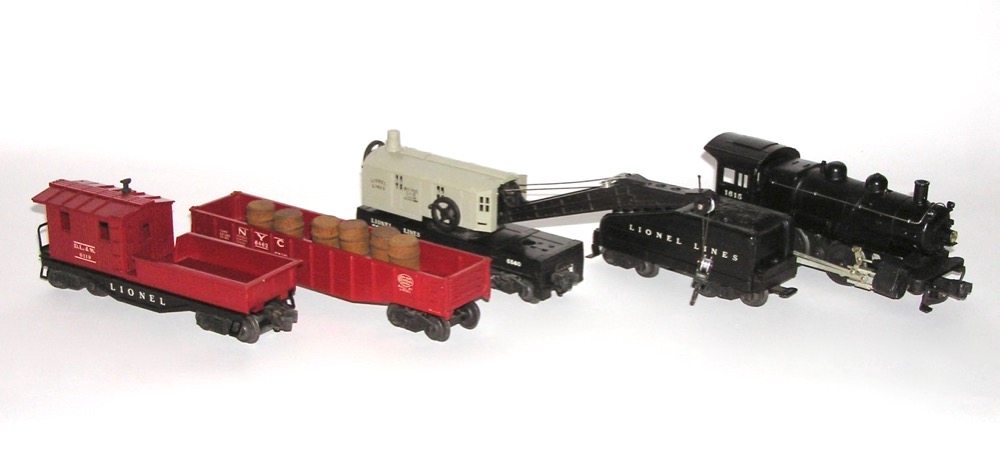 Lionel Set # 1527 w 1615 Switcher 1615T 6462 6560 6119Here is a very nice postwar Lionel "O27" Set from 1955 - the No. 1527 (or No. 502) Three-Car Work Train. This set features the No. 1615 steam Switcher with operating headlight, and its matching No. 1615T slope-back tender. Includes the hard to find No. gray No. 6560 Crane, the red No. 6462 NYC Gondola Car with (6) Barrels, and the No. 6119 Work Caboose. Comes with individual boxes, the 6019 track set, and the hard to find set box. Condition of the trains in the the set is excellent to excellent plus. No breaks or cracks. Engine runs in forward and reverse. Crane works. Individual boxes are fair - some missing some flaps, and some have tape and tears. The engine box is in excellent condition. Set box is in good condition as seen in the pictures. Both interior flaps have been reattached to set. Don't miss. Price: $327 SORRY! SOLD!