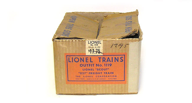Lionel Postwar Freight Set # 1119 Scout 1110 Loco +Here is a great early set of Lionel Trains from 1951. This is the three car freight Set No. 1119W that includes the No. 1110 2-4-2 Scout Steam Locomotivel with its matching 1001T sheet-metal tender. Comes with the following freights - the No. 1002 gondola, the No. 1004 Baby Ruth boxcar and a No. 1007 SP-type caboose. This set includes all individual boxes, and empty transformer box and the Set Box with orange/blue label. Condition of this set is excellent. The 1110 looks great, and I believe the pictures tell the story. Runs. The tender has a couple of spots that have been scratched and now showing some oxidation. The freights are excellent. The boxes show some wear with some tape and missing flaps. The set box has one interior flap missing, and one taped. Don't miss this one! And please ask any questions you may have about the set. Thanks. Price: $87 SORRY! SOLD!