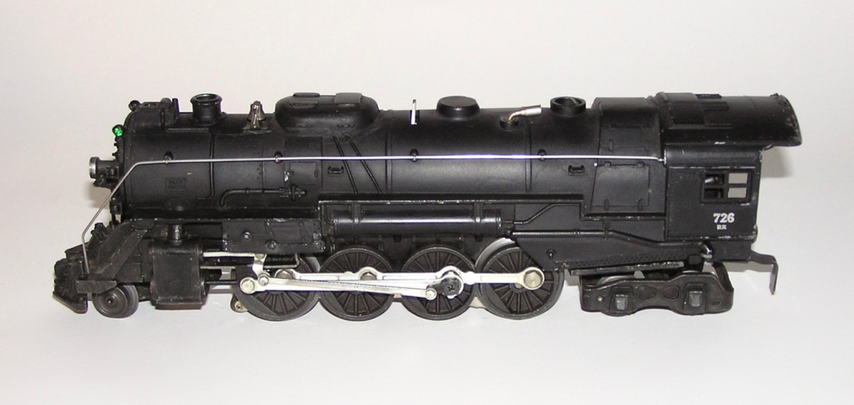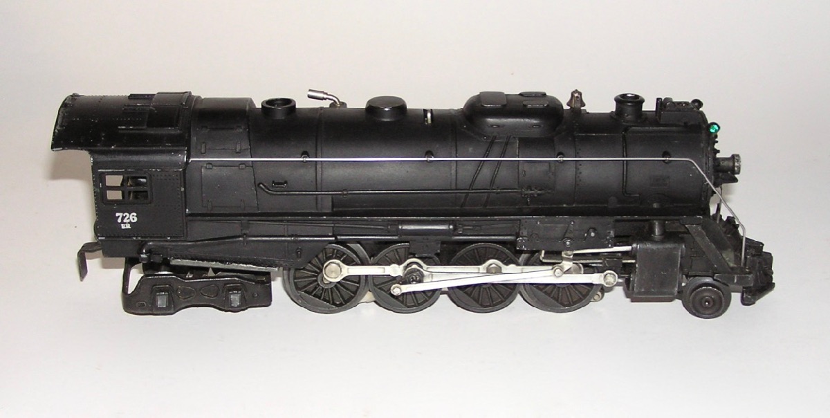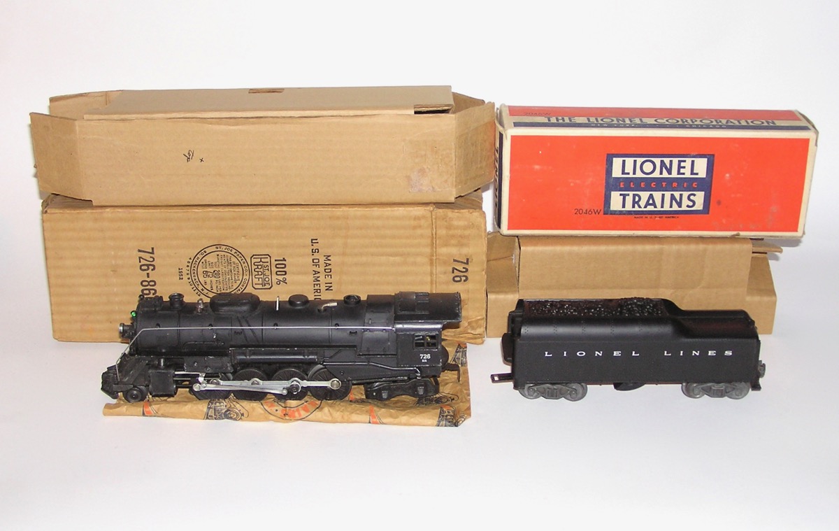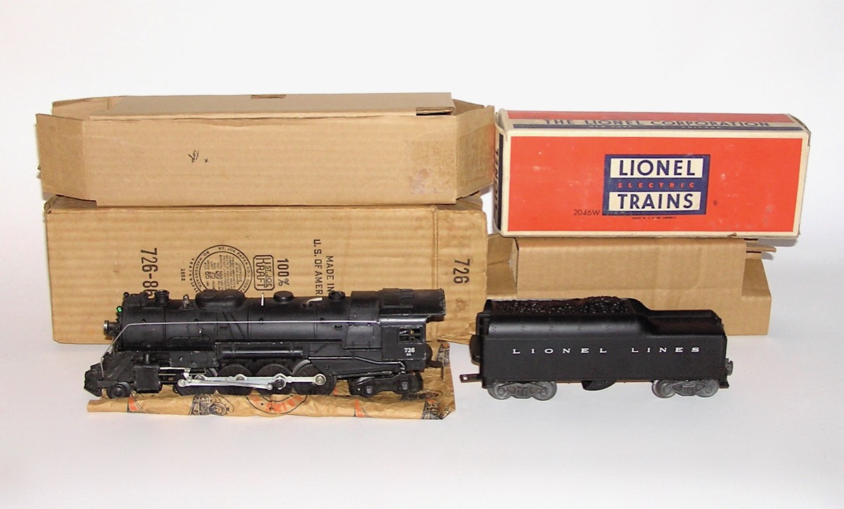 High Grade Lionel # 726RR Steam Engine w /2046W Tender 1952 OBHere is a great looking No. 726RR 2-8-4 Steam Locomotive and its No. 2046W Tender - cataloged in 1952 ONLY. The loco measures 12" long not including its couplers. Condition is excellent plus with very little wear - as seen in ALL the pictures . Clean trucks and couplers. Wheels show very little run time. Engine will need a good cleaning to run. Probably has been used since the 1950s. Tender is also very nice. One of the wires is loose underneath and needs to be attached. Boxes are complete with all flaps and original Inserts. The Engine is marked 1952. Someone wrote on the side indicating that is an early 1946 (which is in correct). One side of the tender box has some scrapes and skinning. Overall, a beautiful set of 1952 trains. Don't miss. Price: $450 Purchase Item! Click for confirmation page, with paying options.