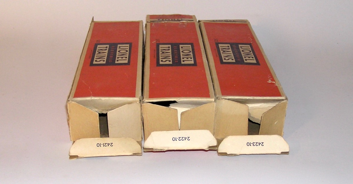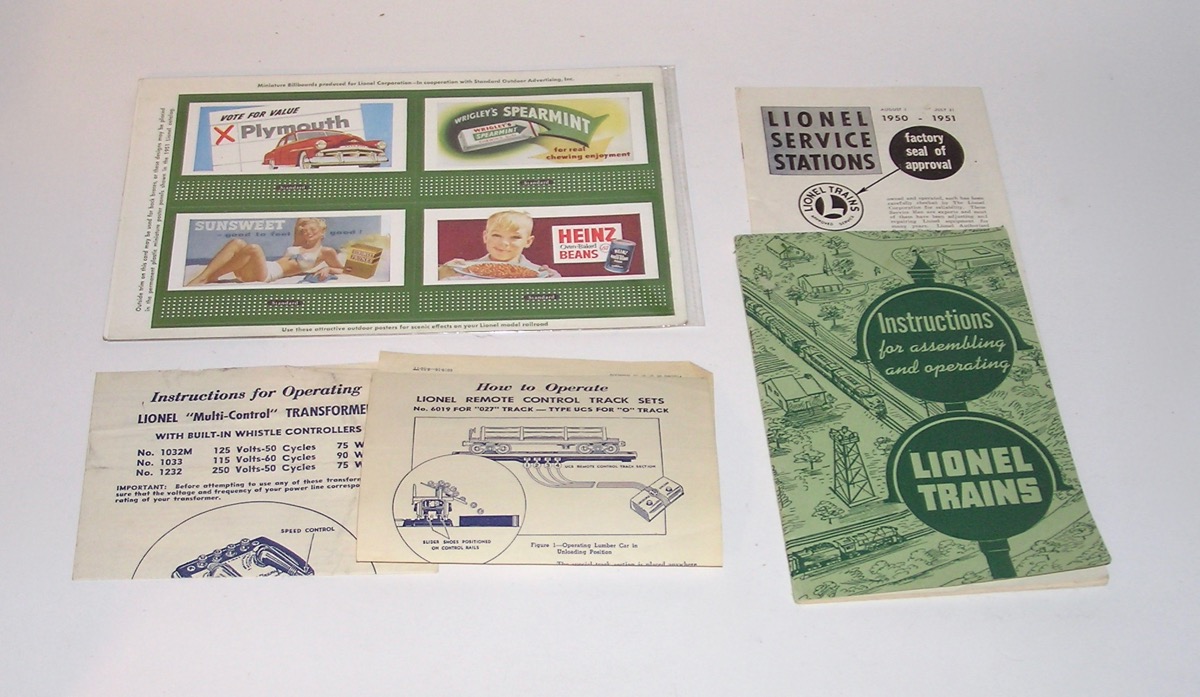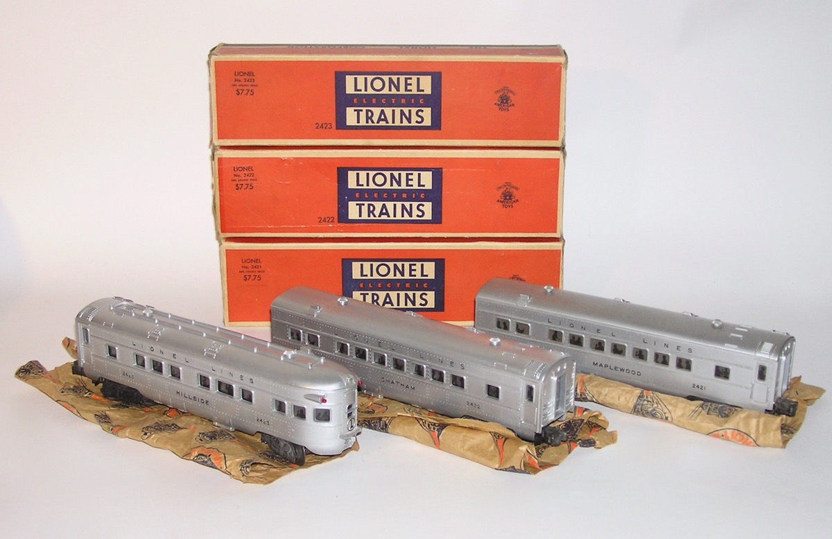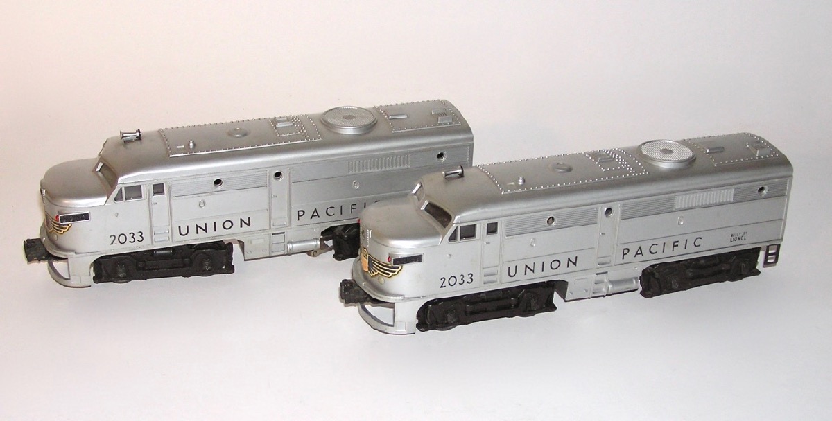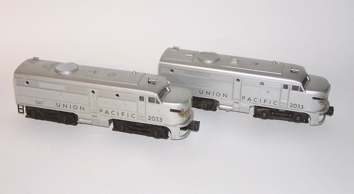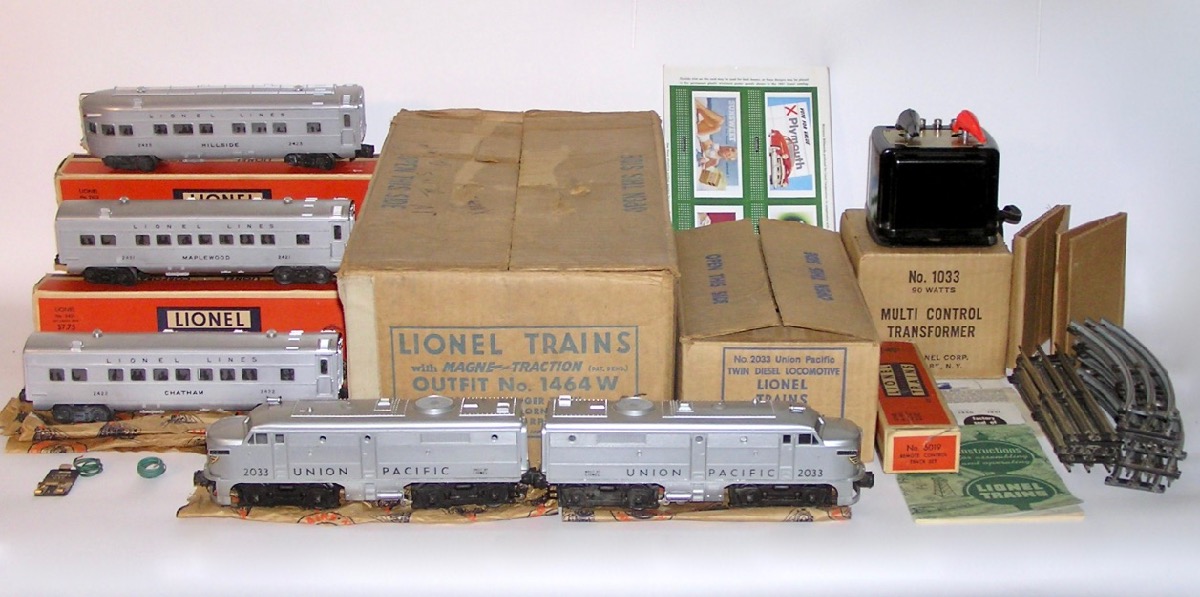 High Grade Union Pacific Diesel Set 1464W w/ 2033 + Passenger Cars OBsHere is an investment quality Lionel postwar set - the No. 1464W Union Pacific Passenger Set that Lionel made circa. 1952. This features the No. 2033 silver top twin AA diesel engines. Included are the silver top lighted passenger cars - No. 2421 Maplewood - the No. 2422 Chatham, and the No. 2423 Hillside Observation car. Comes with the Engine's Master Carton, Passenger Car Boxes, a 1033 Transformer the 6019 remote control track set, CTC Lockon, Lionel paper, the instruction booklet, Billboards, operation instructions, a 1952 catalog and the rare OPC Set Box.with the cardboard divider. All that is pictured. Condition is outstanding as you can see in the pictures. It is very hard to find this set with nice bright silver as new, and this set has it. Only a couple of rub spots and marks, most on the roof of the 2421. Decals on the engines are in great shape. Engine ran when tested. Clean battery compartment. The passenger cars are really nice. A couple of small scratches in a few places, but really nice bright silver finish. These look like they have been on the track, but very little. Engine master carton has all three inserts. and is in great shape. Passenger car boxes have some flap repairs. Most repairs are glued on flaps. A couple of the coupler flaps torn. Some wear to to boxes as pictured. Original paper for the engines, and one for the cars. Paper has some tears and a few with scotch tape repair on back. Set box nice and sturdy and in really nice shape. A great set - not to be missed. I believe the pictures tell the story well, however, if you have any questions let me know. Thanks. Price: $1499 Purchase Item! Click for confirmation page, with paying options.