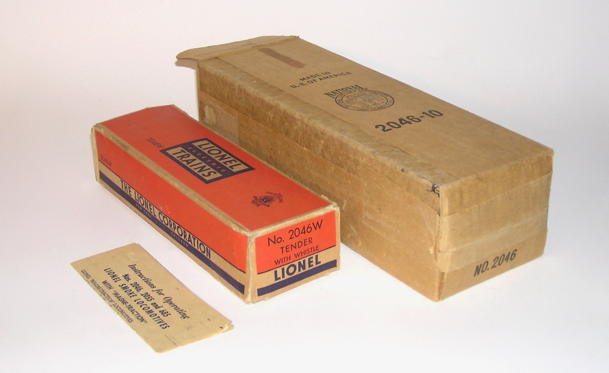 High Grade Lionel 2046 NYC 4-6-4 Locomotive w/ 2046W Tender OBHere is an extremely nice Lionel No. 2046 "O" gauge 2-6-4 steam locomotive from 1951 - with its original No. 2046W Lionel Lines Tender. Heat stamped lettering on the cab with die-cast metal trailing trucks. Loco appears to be in like new condition. I've included many photos for you to see all. No breaks or cracks. Runs in both forward and reverse, but would benefit from a cleaning as it probably hasn't been run since the 1950s. Tender is also really nice - no breaks or cracks. Whistle works one tender wire needs to be reattached. Engine box has a nice original insert, some tape marks on outside. Tender box show some wear on creases. Instruction sheet included. A really nice engine and tender. Please ask any questions. Thanks. Price: $350 Purchase Item! Click for confirmation page, with paying options.