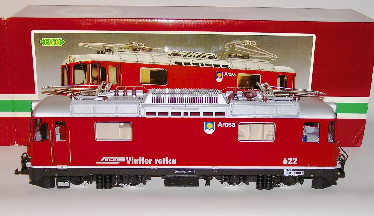 LGB # 2043 RhB Arosa 622 Ge 4/4 II Locomotive G Scale . Length 24 in. This is new in the box with all materials. Just a beautiful G scale Train Engine.