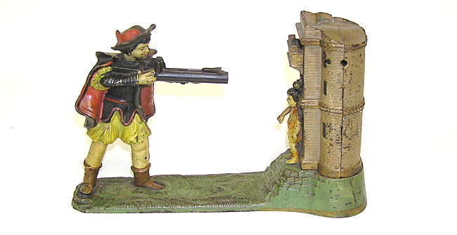 J & E Stevens Cast Iron William Tell Mechanical BankThis is the J & E Stevens, designed by Russell Frisbie, William Tell mechanical bank. Patented in 1896. Place a coin on the barrel of the rifle. Press the foot and the coin shoots the apple from the boys head. The bank measures 10-1/2" long by 6-1/2" high. It is in excellent condition with no breaks, cracks or repairs. Nice overall paint. A good example. Don't miss this one. Price: $799 SORRY! SOLD!