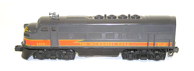 Lionel No. 2378 Milwaukee Road F-3 AB Diesels -Nice!Here is an extremely nice pair of Lionel No. 2378 Milwaukee Road F-3 AB Diesels. Also, includes the 2378 "B" Box. These are the AB Diesels with Dual Motors, Magnetraction and Horn that Lionel made circa 1956. Non-Pinstripes Variation. Condition is excellent - as seen in the pictures. Runs well in forward and reverse, but like all older engines would benefit from a cleaning to run perfectly. The powered unit has a couple of surface scratches, and a small amount of touch-up on the decal to fill in the frame of the door, but other than that I can't find much wrong with these beautiful units. Battery compartment is clean. Box has some writing on it. Does have both end flaps. Please check out the pictures carefully, and if you have any questions let me know. A real nice set! Price: $1249 SORRY! SOLD!