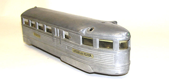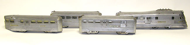 American Flyer Burlington Zephyr 9900 Streamliner SetHere is a great looking set of American Flyer prewar "O" gauge trains. This is the Burlington Zephyr Streamliner Set No. 1327-RCT, made in 1935. This cast aluminum set features the longer 9914 powered engine with sliding baggage type doors. It also includes the No. 9911 baggage car, the 9913 pullman coach, and the 9912 observation. The set is in very good condition — as seen in the pictures. This will clean-up nicely. Engine runs and cars light up. Please ask any questions. One for the Flyer collector. Price: $852 SORRY! SOLD!