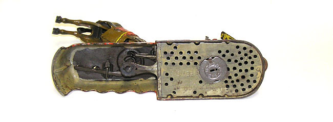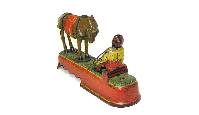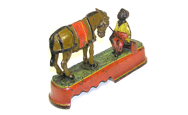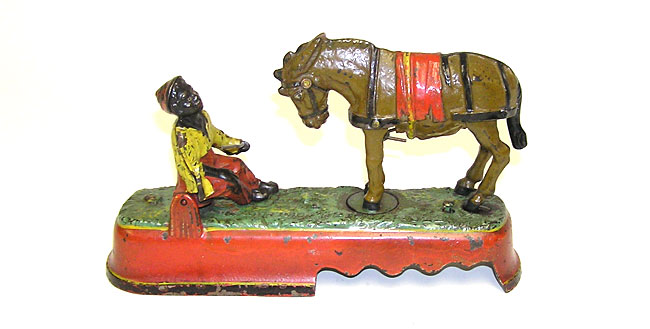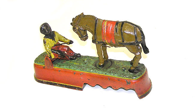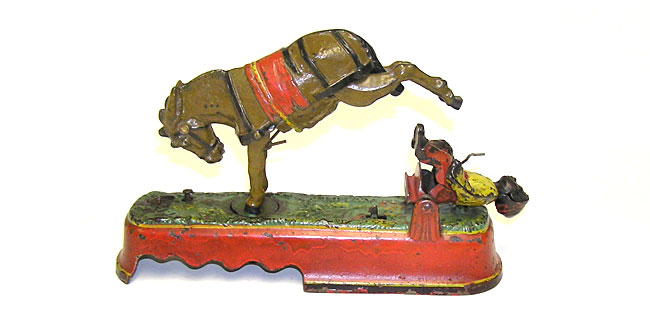 Always Did Spise a Mule Cast Iron Mechanical BankThis is a very nice "I Always Did Spise a Mule" cast iron mechanical bank - made by J & E. Stevens in the late 1800s. You press the button on the base and the horse turns and kicks the boy back on his bench - as the coin flies into the seat of the bench. The condition of the bank is excellent - as seen in the pictures. No breaks or cracks. All original. One for the collection. Price: $821 SORRY! SOLD!