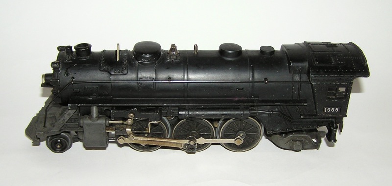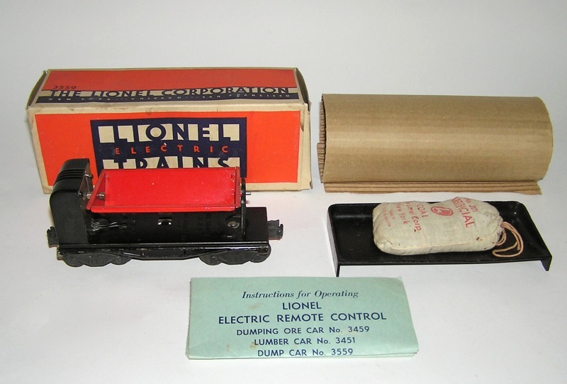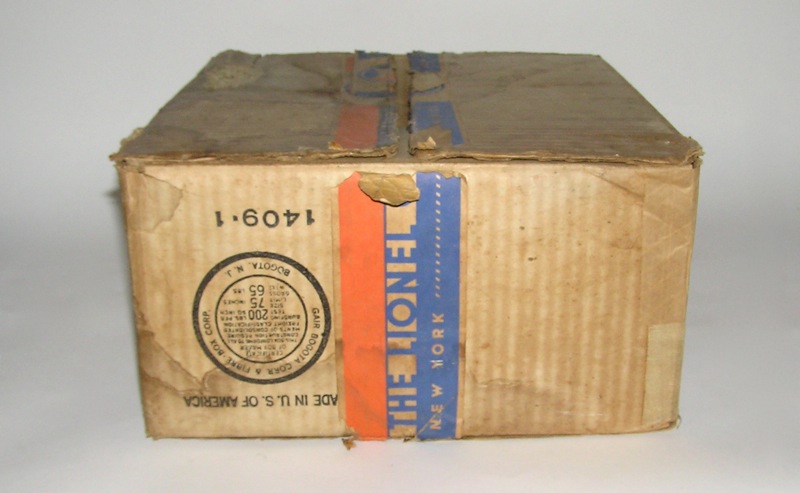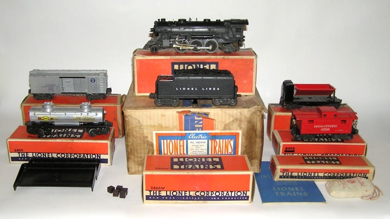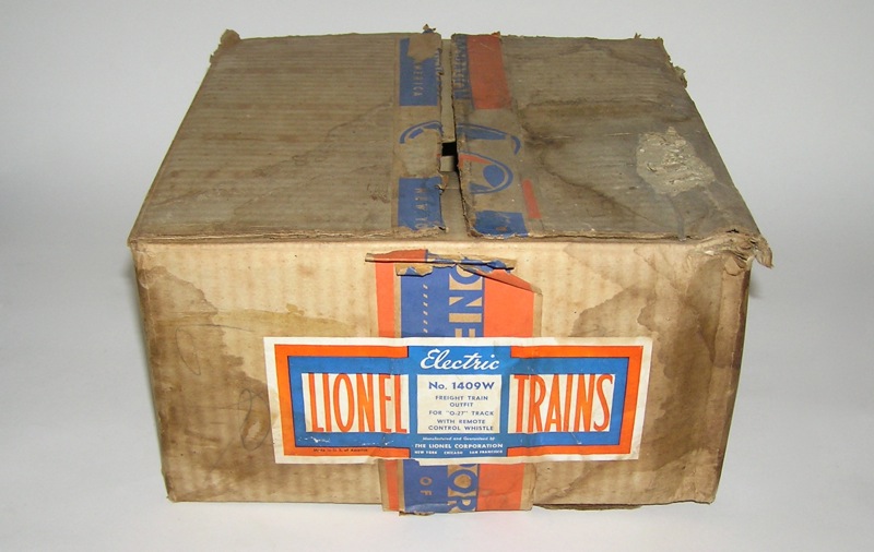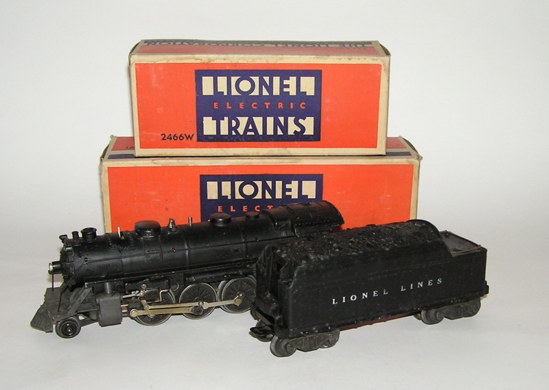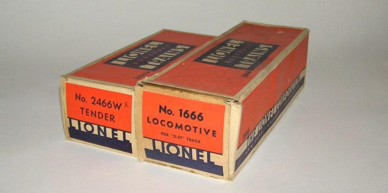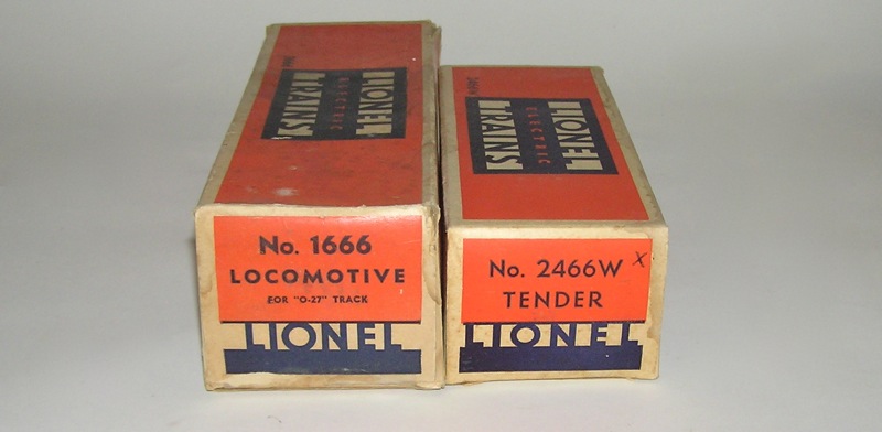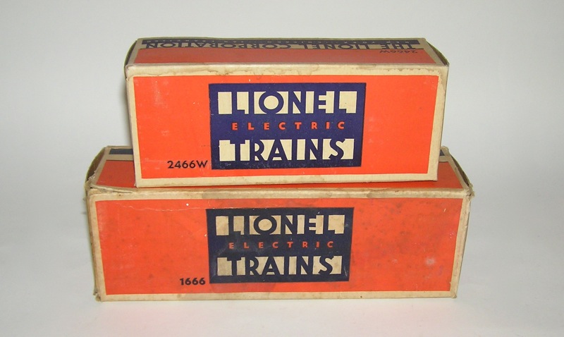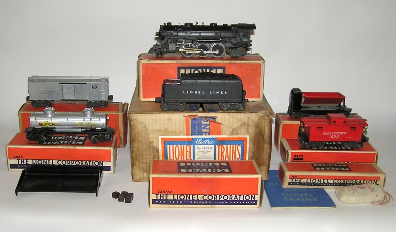 Lionel Early Postwar Freight Set # 1409W 1666 2466WX w/3454 Flying Shoe CouplerHere is a neat set of early postwar Lionel Trains - from 1946. This is Freight Set No. 1409W. It includes the 2-6-2 No. 1666 steam locomotive with its matching No. 2466WX tender. These are pulling a No. 2465 silver Sunoco two dome tank car, a No. 3454 operating merchandise car, the No. 3559 dump car with rainbow 160 bin and a No. 2472 caboose The set includes all the individual boxes, the No. 1019 track controller set, 1946 Instruction booklet, and the Set Box. All that is pictured below. What a great looking set. And in nice original condition. This is the set where the Engine has the blackened handrail, tender with "flying shoe" couplers and the Freight Cars that also have "flying shoe" type couplers. The wheels are thick axle with deep dish wheels. The engine and tender are in nice condition. The Engine is clean, and when put on a track it hums, but did not run. Wheels turn freely. A good cleaning is necessary. The Tender has some age marks on the plastic shell, but trucks and couplers are intact and in very good condition. When tested the whistle worked fine. The boxes look nice and both have their original inserts. But like all the boxes in this set, they have some water stain marks. The 2465 Tank car is beautiful. Hardly any wear. Nice crossed out box. The 3454 Merchandising car is also very nice. Box shows wear and staining, and is missing one interior flap. Does have its insert, instruction sheet, rainbow bin, and original crates. Also a nice 3559 Dump Car. Comes with its original liner, rainbow bin, bag of coal and instruction sheet. The Set Box has some wear and staining as pictured with a nice complete label. Great looking set not to be missed. Enjoy all the pictures. Thanks. Price: $429 SORRY! SOLD!
