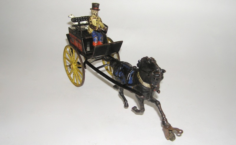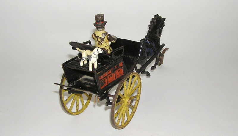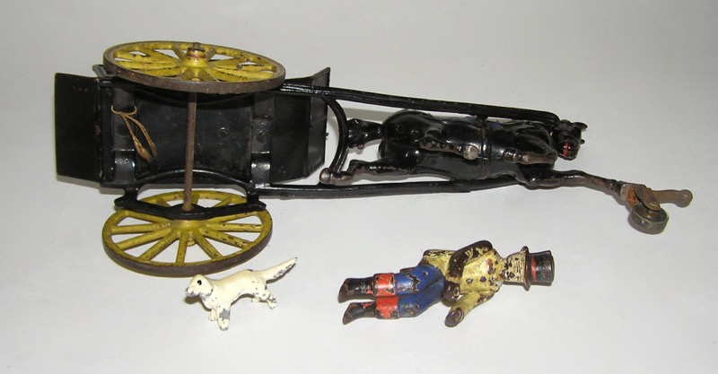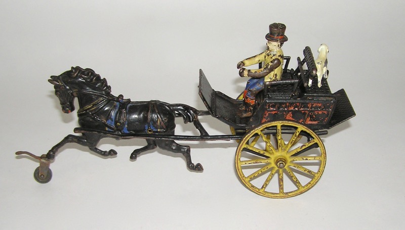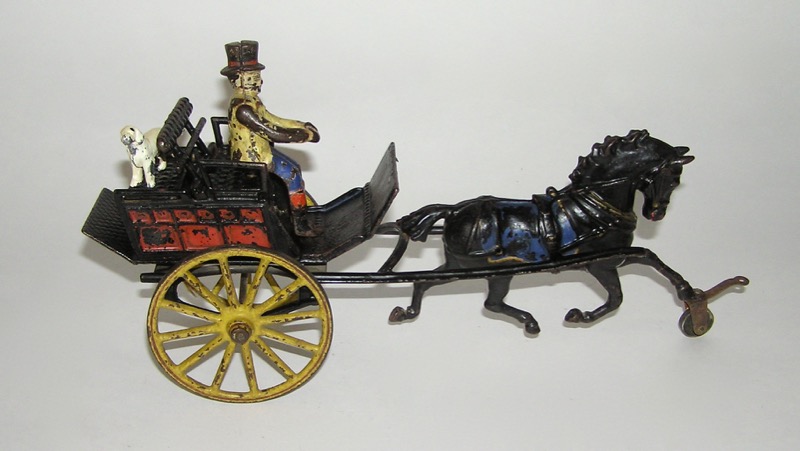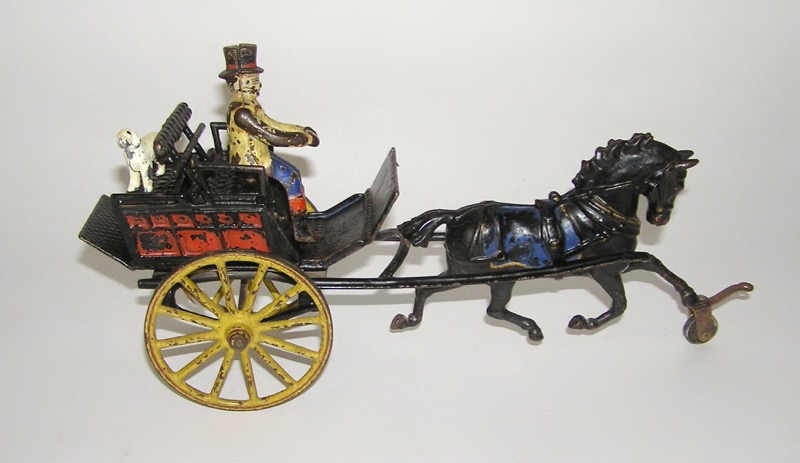 Rare Pratt & Letchworth Cast Iron Horse Drawn "Dog Cart"Here is a great looking cast iron toy made in the late 1800's. This is the fairly hard to find horse drawn DOG CART made by the famous toy maker - Pratt & Letchworth. Pratt & Letchworth made some of the finest, and sought after, cast iron toys around the turn of the century. Their cast iron work is outstanding, and the paint is finely detailed. This toy measures 12" long. It is in excellent condition - as seen in the pictures below. Some wear to the original paint both on the cart and horses blanket. Driver for the toy is the original figure and in good shape. Comes with a little dog on the back. A great looking piece - don't miss. Price: $550 SORRY! SOLD!