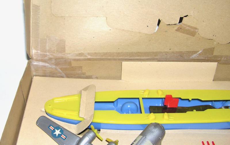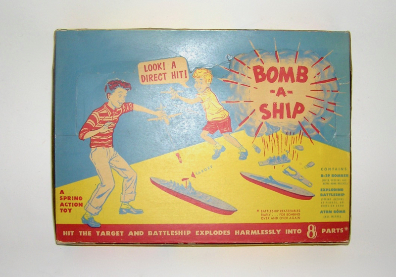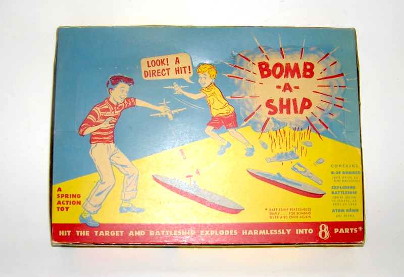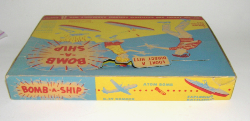 Thomas Toys BOMB-A-SHIP B-29 BOMBER ATOM BOMB Exploding ShipHere is a very nice Thomas Toys BOMB-A-SHIP - B-29 BOMBER ATOM BOMB Exploding Ship Toy. Comes in its original BOX with nice color graphics. Great looking toy that appears to be in excellent original condition - as pictured. Complete. "Hit the target and Battleship expldes harmlessly into 8 parts" Cool! Some minor wear to the box with some tape on the inside. Box measures 15" long, 10-1/2" wide, and 2" high. Nice colors and details. Don't miss. Thanks. Price: $129.95 SORRY! SOLD!