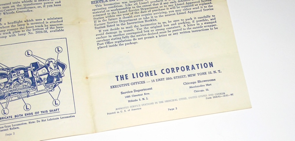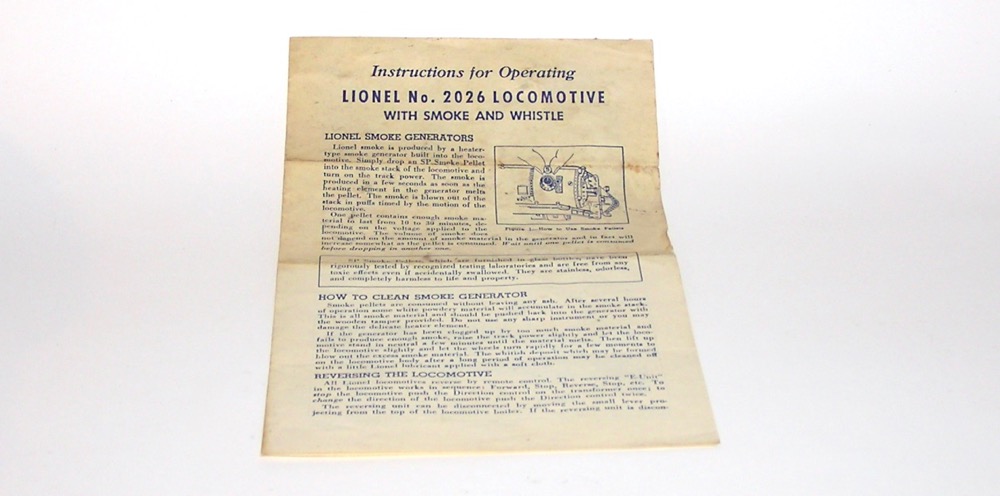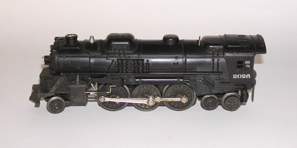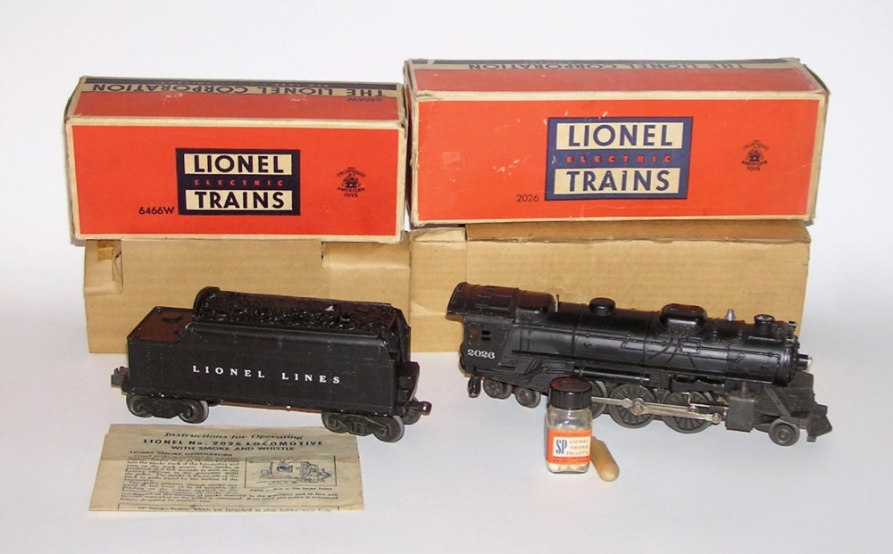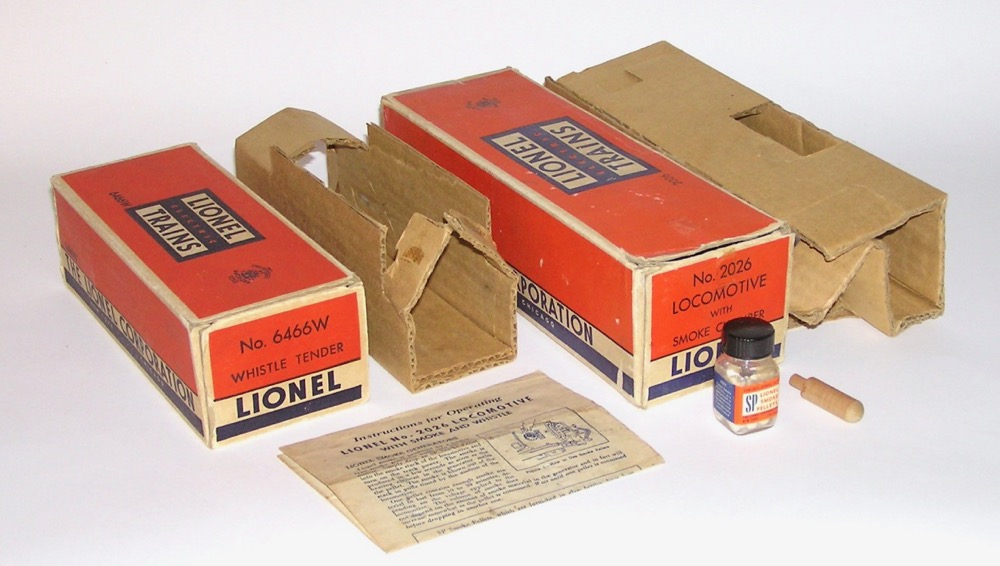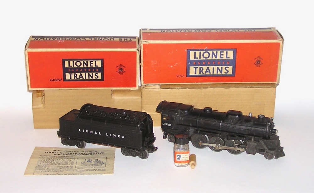 Lionel 2026 2-6-2 Steam Engine with 6466W Whistle Tender From 1951 - Nice!Here is an extremely nice Lionel No. 2026 2-6-2 steam loco with its matching 6466W whistle tender. JUst a gorgeaus set that comes with its boxes, liners, instruction sheet and smoke pellets with tamper. All that is pictured. Theseengine and tender are in excellent plus condition - as you can see in all the pictures. Engine looks extremely nice with no problems that I see. Ran in forward and reverse when tested. Tender looks the same. Whistles fine. Engine box does some some skinning and wear. All flaps present. Tender box in great shape. Both with quality cardboard inserts. Instruction sheet marked -51. Don't miss these high quality Lionel trains. Buy with confidence. Thanks. Price: $137 SORRY! SOLD!